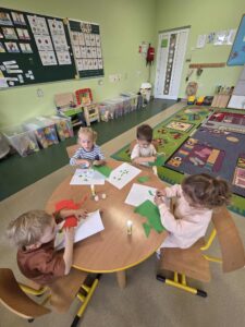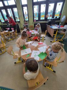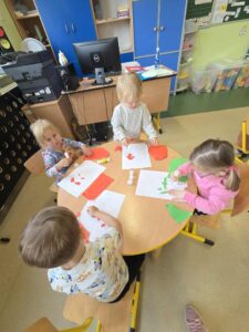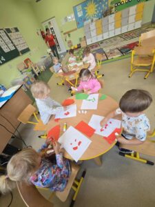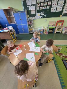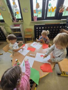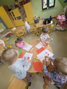 Dzisiaj obchodziliśmy Dzień Jabłka. Opowiedzieliśmy sobie o smaku i wyglądzie jabłek, ćwiczyliśmy sprawność manualną poprzez wyklejanie szablonu jabłka przy pomocy papieru kolorowego. Na zakończenie mieliśmy najlepszą atrakcję- zrobiliśmy sok jabłkowy z obranych jabłek, który szybko wypiliśmy- był pyszny:)