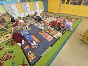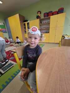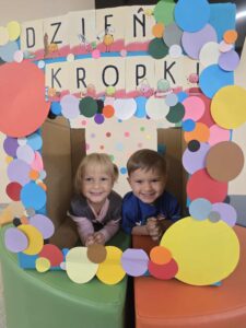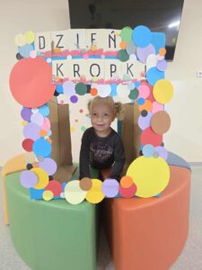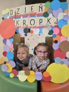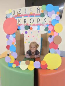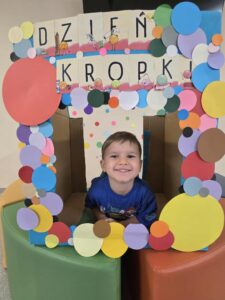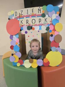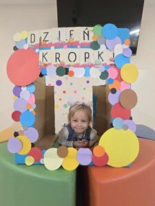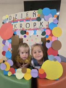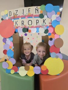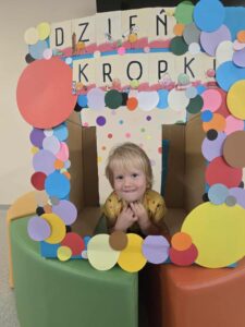 15 września obchodziliśmy Dzień Kropki. Niektórzy z nas mieli na sobie ubranie z elementem kropek. Przed śniadaniem wzięliśmy udział w gimnastyce z kropką 🙂 Następnie stworzyliśmy pracę plastyczną- pawia, przy pomocy farb i naszych paluszków. Prace powiesiliśmy na naszej przedszkolnej tablicy w holu. Na zakończenie zrobiliśmy sobie zdjęcia w kropkowej fotobudce i założyliśmy koronę z kropką.