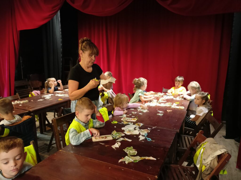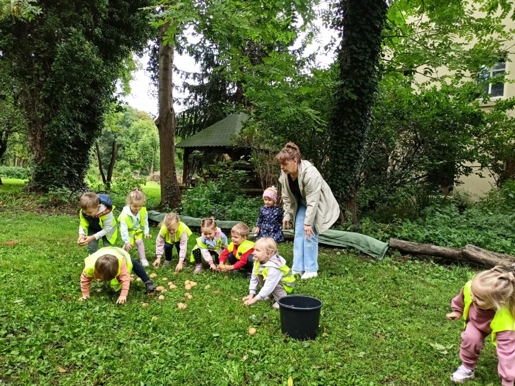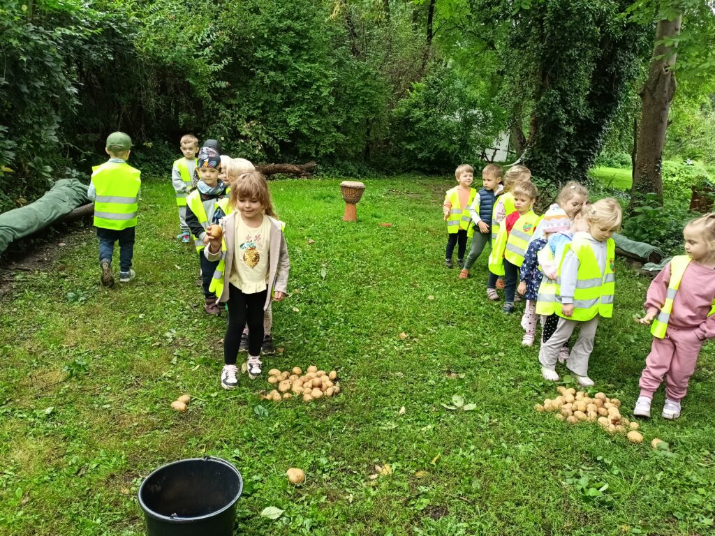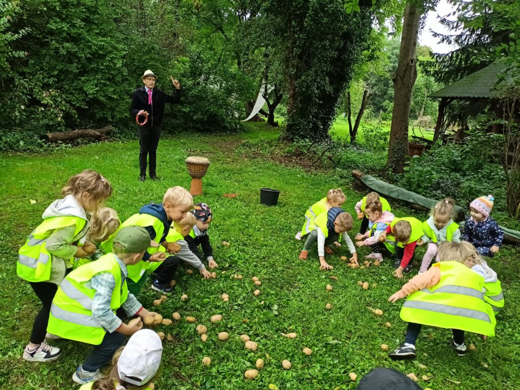 15 września dzieci z grupy „Lisków” wybrały się na pierwszą w tym roku szkolnym wycieczkę do Kryształowic. To już kolejna wizyta „Lisków” w Kryształowicach, tym razem na „Święcie Pieczonego Ziemniaka”. Najpierw wysłuchaliśmy historii ziemniaka opowiedzianej nam za pomocą dramy przez Pana Darka. Później tworzyliśmy pamiątkowe jesienne obrazki za pomocą techniki decoupage. Był taż czas na ruchowe zabawy ziemniaczane zakończone degustacją pieczonych ziemniaków prosto z ogniska. Takie ziemniaczki z solą i masłem smakowały nam obłędnie. To była udana wycieczka, bo nawet kapryśna pogoda dopisała.