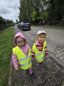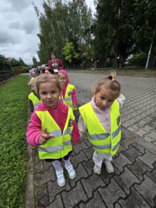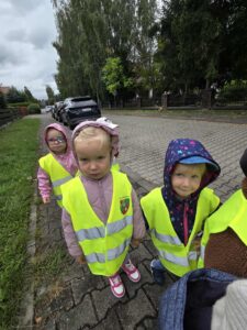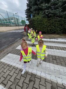 17 września wybraliśmy się na pierwszą wycieczkę- spacer wokół terenu przedszkola i szkoły. Podczas spaceru poznaliśmy zasady bezpiecznego poruszania się po chodniku i ulicy, przy okazji ćwiczyliśmy chodzenie w parach. Nauczyliśmy się prawidłowo przechodzić przez pasy w parach – wiemy, że należy zatrzymać się przed przejściem, spojrzeć w lewo, potem w prawo, a następnie ponownie w lewo przed wejściem na jezdnię. Przypomnieliśmy sobie sygnalizacje świetlną. To była naprawdę pouczająca i udana wycieczka. 🙂