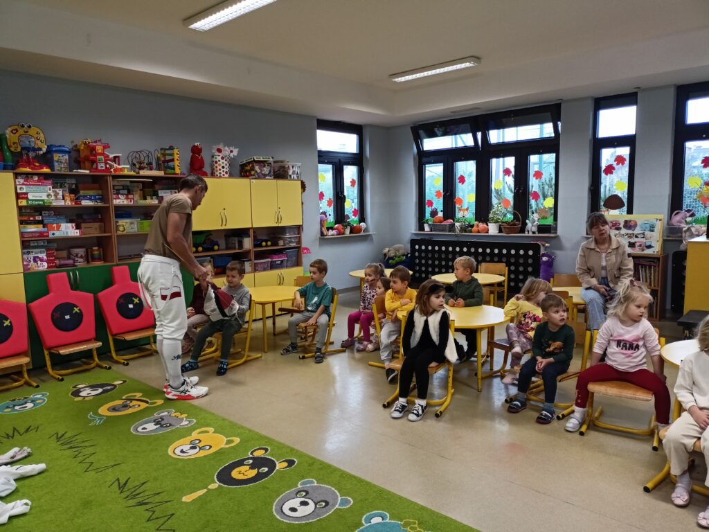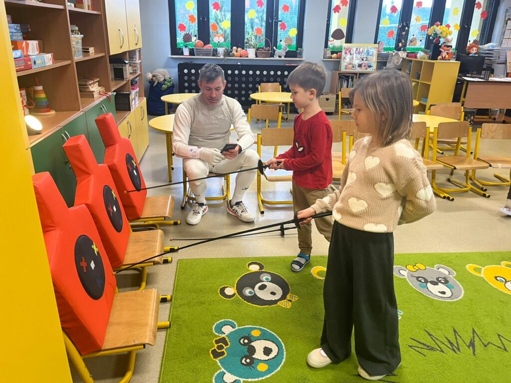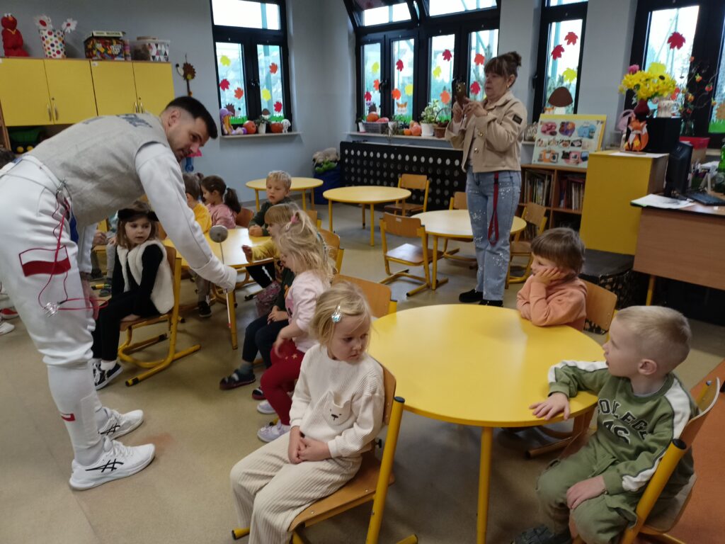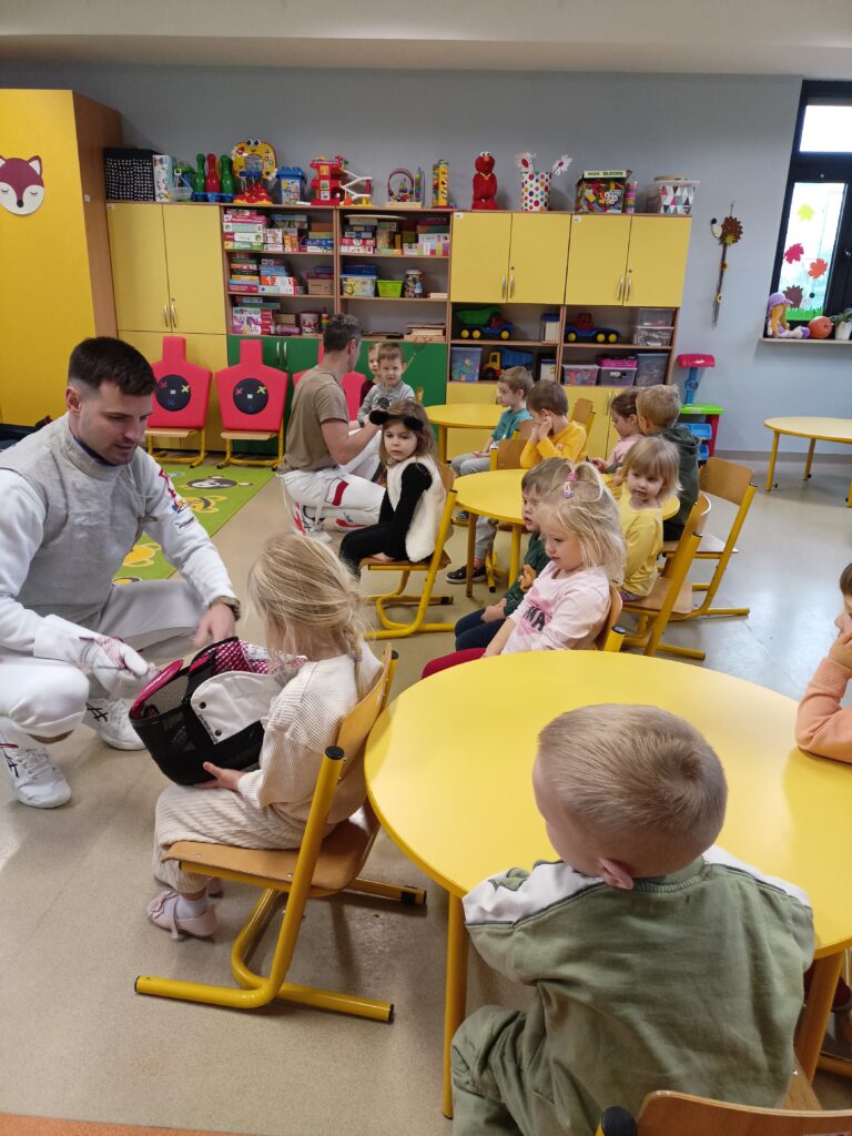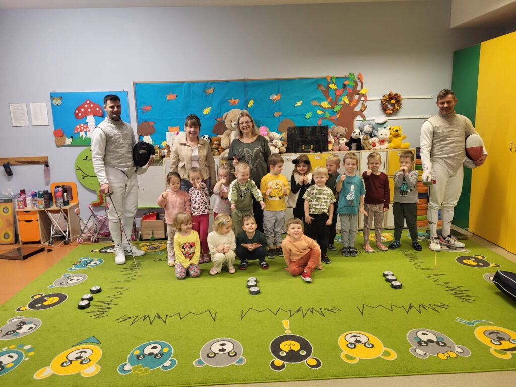 We wtorek w przedszkolu odbyło się spotkanie z Mistrzami w ramach projektu „Od przedszkolaka do olimpijczyka”. Był to pokaz szermierki, jednej z najstarszych dyscyplin sportowych – dynamiczny, bezpieczny i pełen zabawy. Naszymi gośćmi byli: pan Leszek Rajski 13-krotny drużynowy mistrz Polski i 7-krotny indywidualny mistrz Polski oraz pan Paweł Szumilewicz 13-krotny drużynowy mistrz Polski. Panowie zaprezentowali strój i wyposażenie szermierza. Pokazali jak wygląda prawdziwa walka na planszy. Dzieci poznały podstawowe pojęcia i ruchy szermiercze oraz sposób punktowania. Całość uzupełniły krótkie zabawy i minizadania, które pozwoliły dzieciom poczuć się jak prawdziwi sportowcy. Dzieci używały sprzętu treningowego dla najmłodszych zawodników. Pokaz miał charakter edukacyjny i sportowy, rozwijał koordynacje ruchową, koncentrację, refleks oraz uczył zasady bezpiecznej zabawy i fair play.
