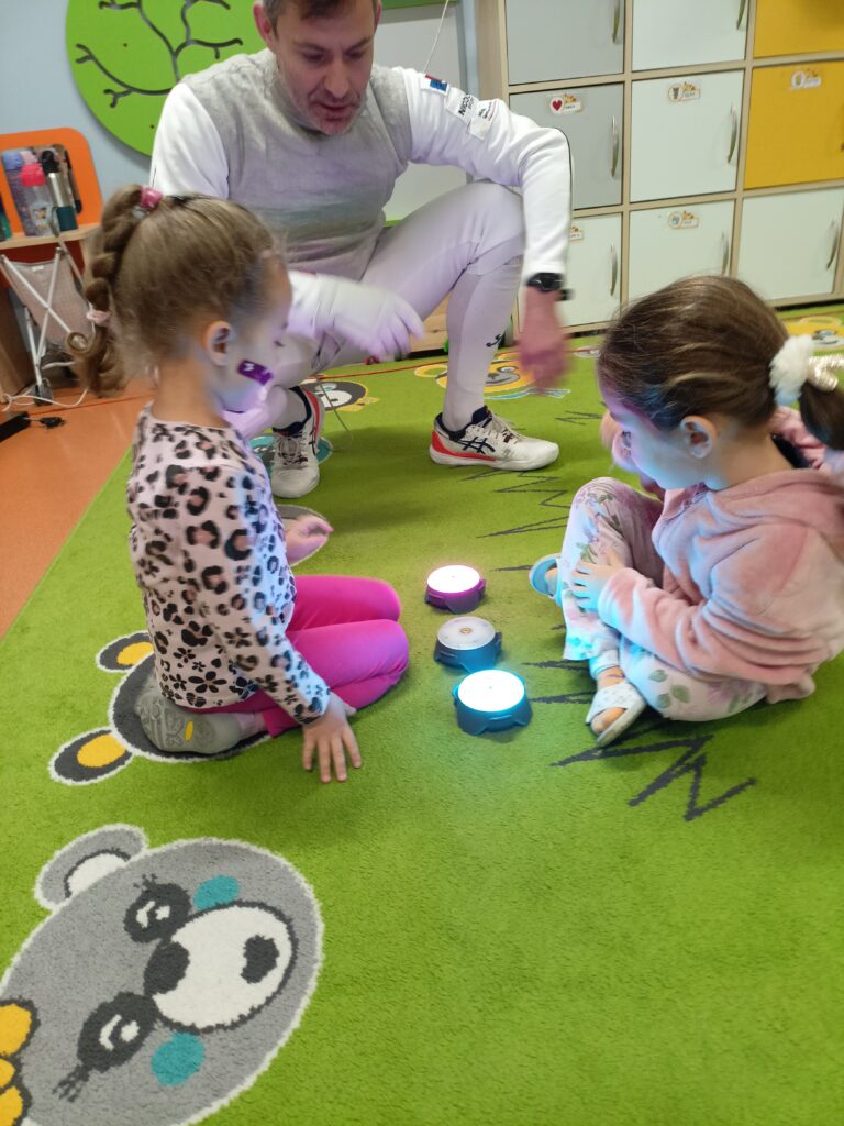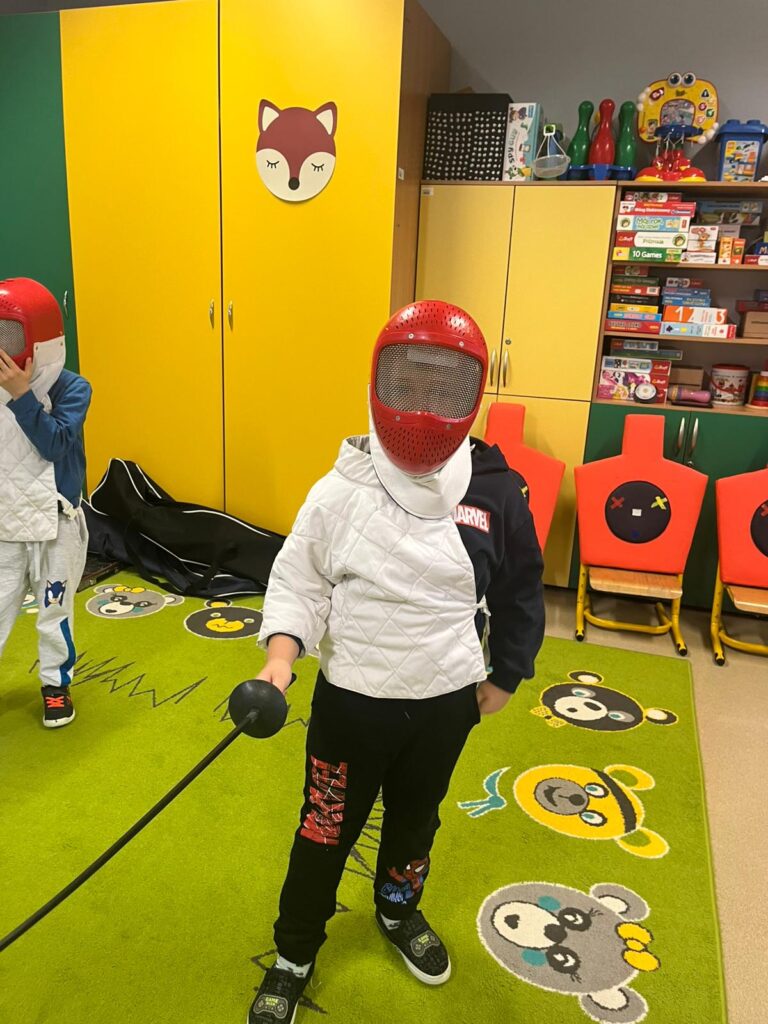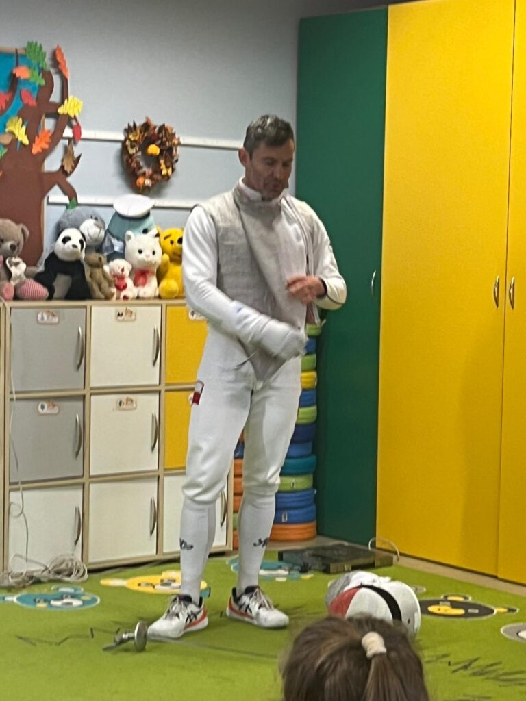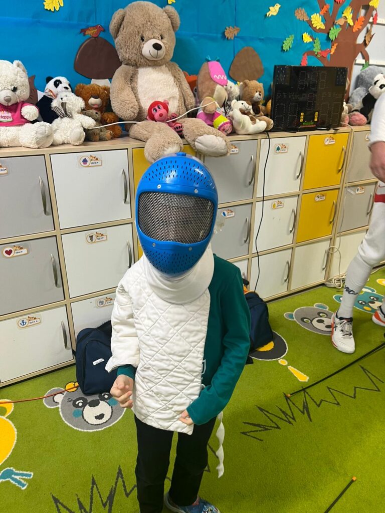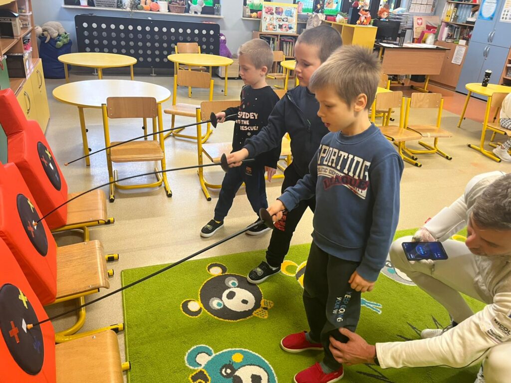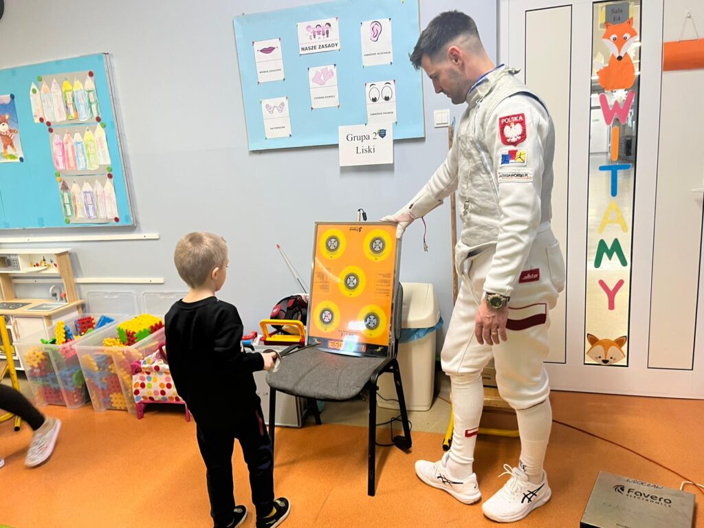 We wtorek w przedszkolu odbyło się spotkanie z Mistrzami w ramach projektu „Od przedszkolaka do olimpijczyka”. Był to pokaz szermierki, jednej z najstarszych dyscyplin sportowych – dynamiczny, bezpieczny i pełen zabawy. Naszymi gośćmi byli: pan Leszek Rajski 13-krotny drużynowy mistrz Polski i 7-krotny indywidualny mistrz Polski oraz pan Paweł Szumilewicz 13-krotny drużynowy mistrz Polski. Panowie zaprezentowali strój i wyposażenie szermierza. Pokazali jak wygląda prawdziwa walka na planszy. Dzieci poznały podstawowe pojęcia i ruchy szermiercze oraz sposób punktowania. Całość uzupełniły krótkie zabawy i minizadania, które pozwoliły dzieciom poczuć się jak prawdziwi sportowcy. Dzieci używały sprzętu treningowego dla najmłodszych zawodników. Pokaz miał charakter edukacyjny i sportowy, rozwijał koordynacje ruchową, koncentrację, refleks oraz uczył zasady bezpiecznej zabawy i fair play.