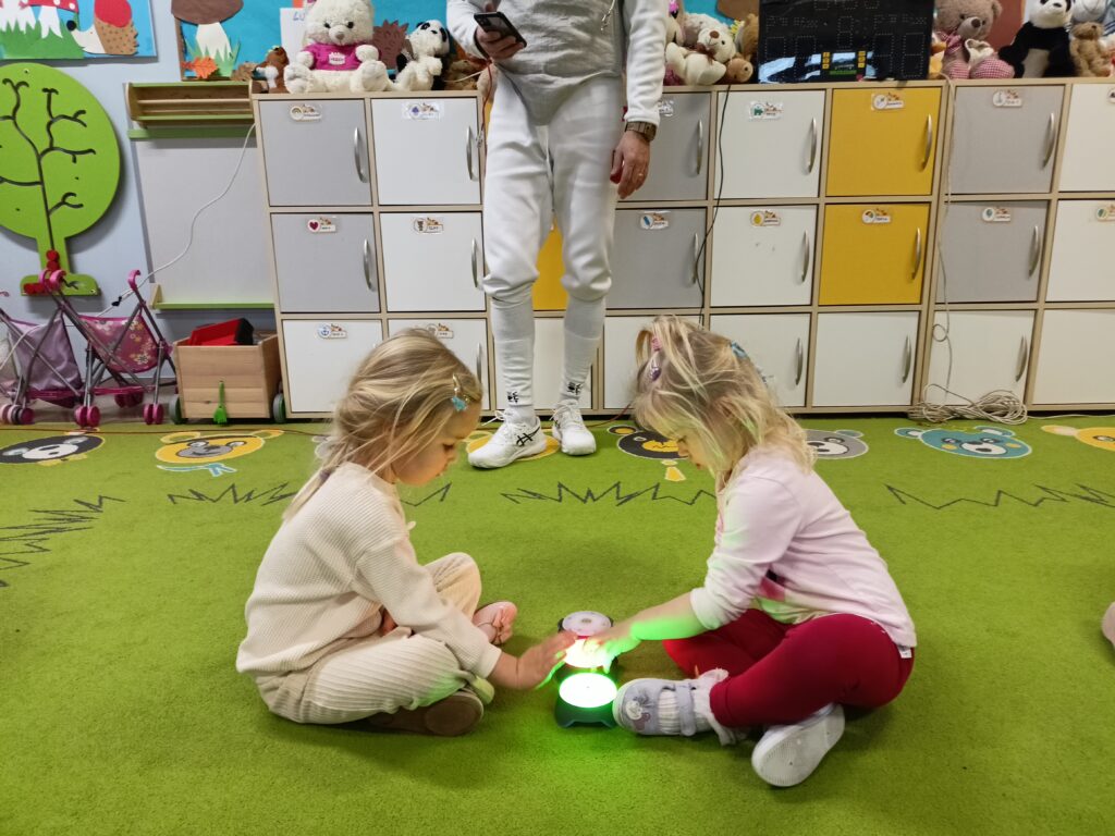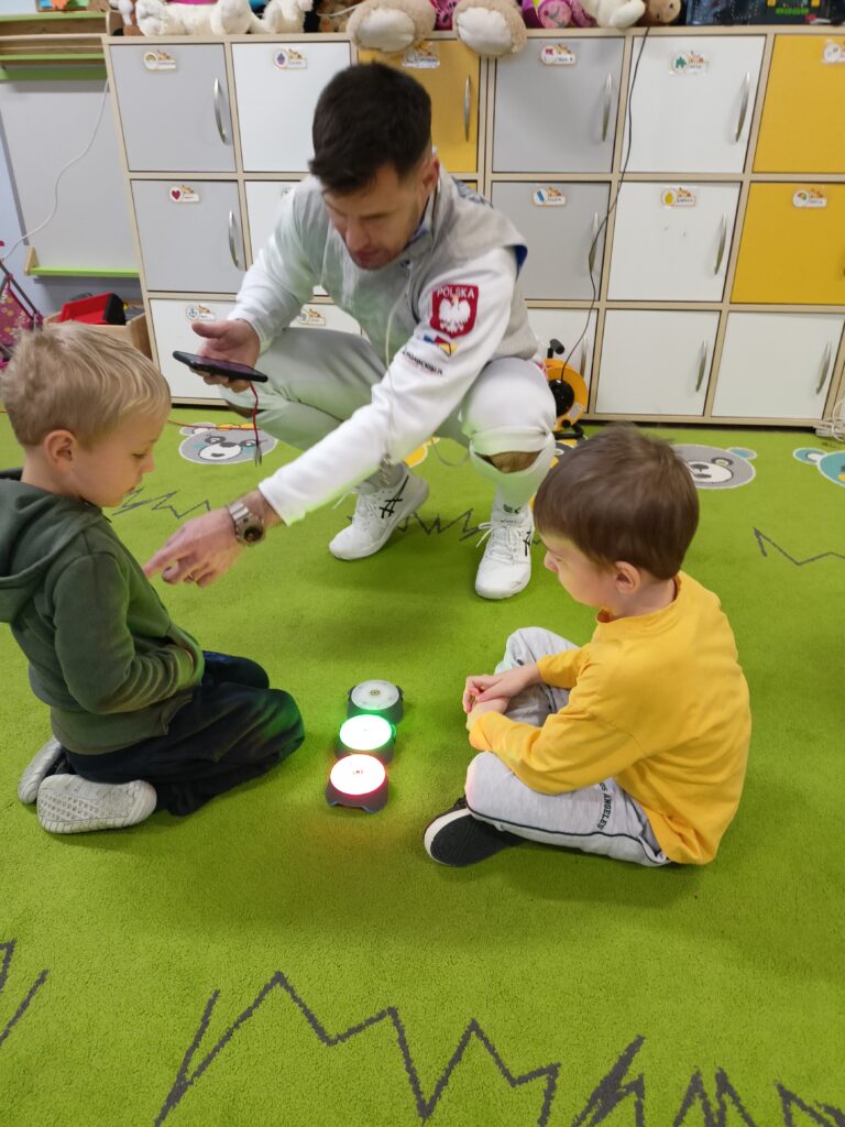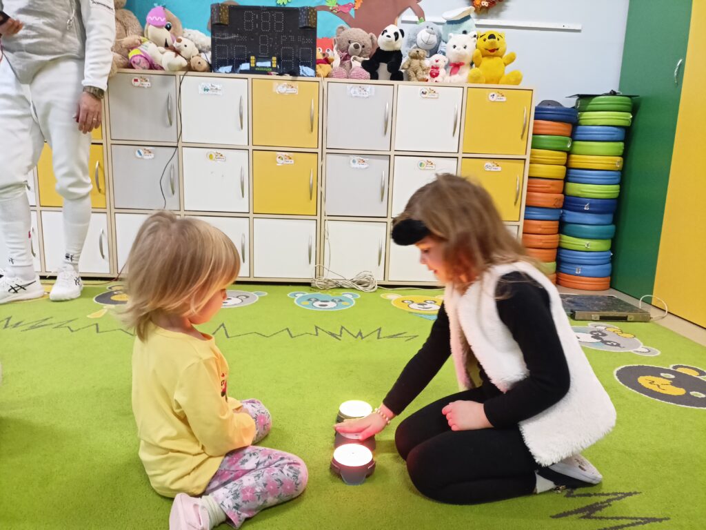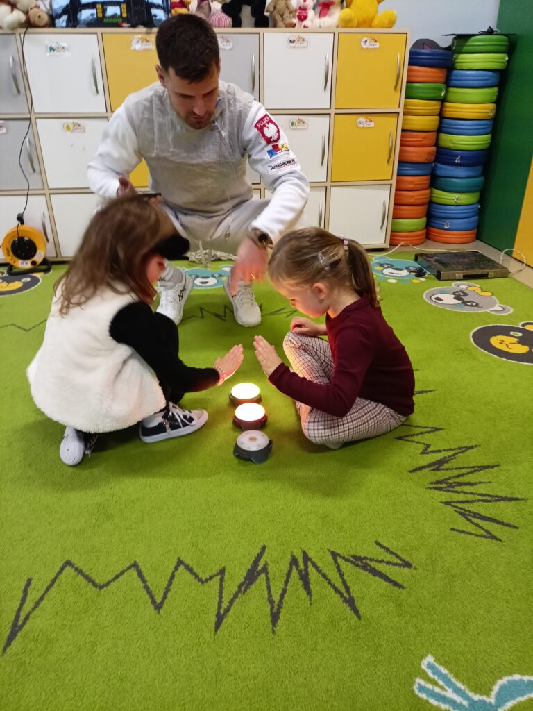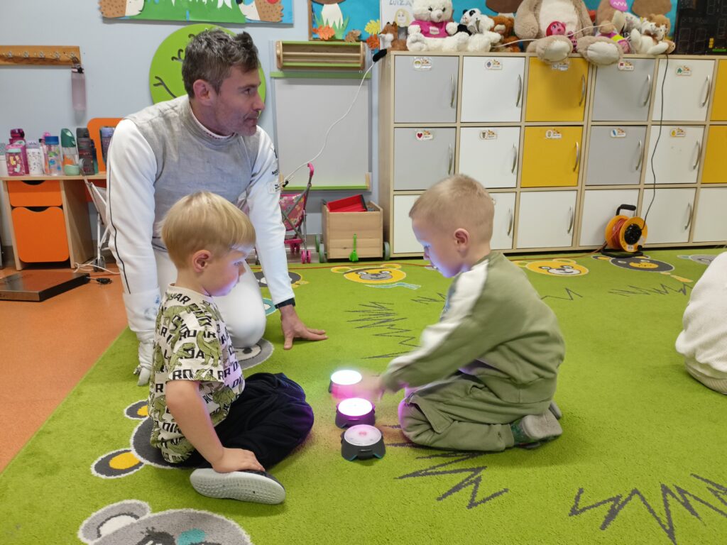 We wtorek w przedszkolu odbyło się spotkanie z Mistrzami w ramach projektu „Od przedszkolaka do olimpijczyka”. Był to pokaz szermierki, jednej z najstarszych dyscyplin sportowych – dynamiczny, bezpieczny i pełen zabawy. Naszymi gośćmi byli: pan Leszek Rajski 13-krotny drużynowy mistrz Polski i 7-krotny indywidualny mistrz Polski oraz pan Paweł Szumilewicz 13-krotny drużynowy mistrz Polski. Panowie zaprezentowali strój i wyposażenie szermierza. Pokazali jak wygląda prawdziwa walka na planszy. Dzieci poznały podstawowe pojęcia i ruchy szermiercze oraz sposób punktowania. Całość uzupełniły krótkie zabawy i minizadania, które pozwoliły dzieciom poczuć się jak prawdziwi sportowcy. Dzieci używały sprzętu treningowego dla najmłodszych zawodników. Pokaz miał charakter edukacyjny i sportowy, rozwijał koordynacje ruchową, koncentrację, refleks oraz uczył zasady bezpiecznej zabawy i fair play.